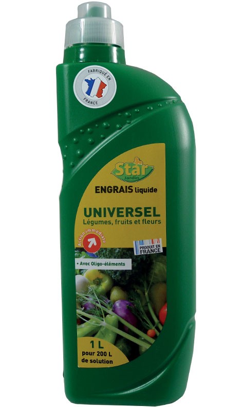 L’engrais liquide universel Star Jardin est une formule adaptée qui convient parfaitement à toutes les cultures du jardin. Il satisfait la nutrition de toutes les plantes dans les jardins et les potagers, mais aussi pour les plantes d’intérieur. Il apporte force et vitalité à vos végétaux en leur apportant les éléments nutritifs essentiels (N – P2O5 – K2O) enrichis en oligo-éléments. Son action est immédiate : Sa formulation spécifique libère tous les éléments fertilisants très rapidement. Les résultats sont visibles quelques jours seulement après l’application. Une formule spécifique : L’azote pour la croissance des végétaux et le développement du feuillage. Le phosphore pour un meilleur enracinement de vos plantes. Le potassium pour la floraison, la coloration ; et pour améliorer la résistance aux parasites, maladies et à la sécheresse. Oligo éléments. Ils agissent de manière particulière pour remplir les fonctions physiologiques de la plante. Leur rôle est essentiel pour permettre les réactions d’oxydo-réduction du système enzymatique des plantes (photosynthèse, fixation de l’azote, réduction des nitrates dans la plante…).